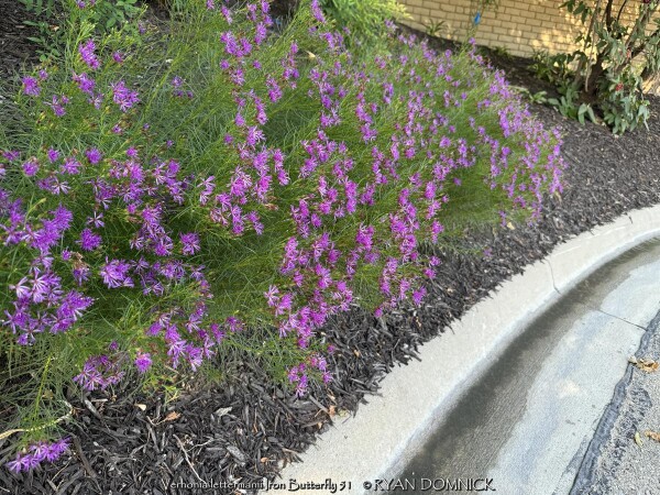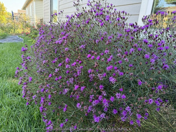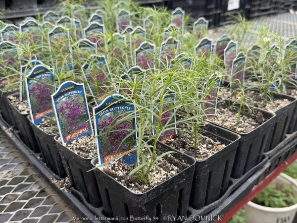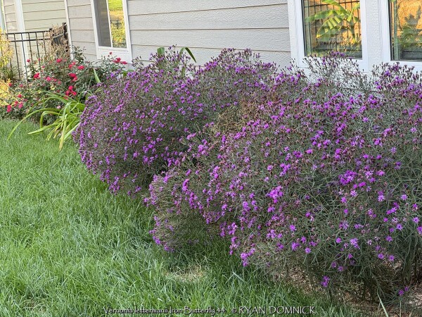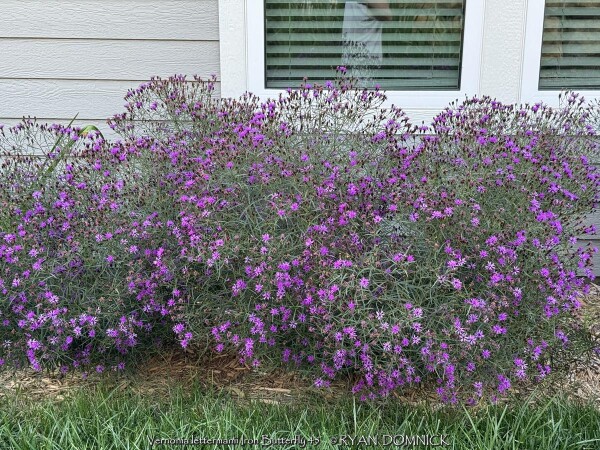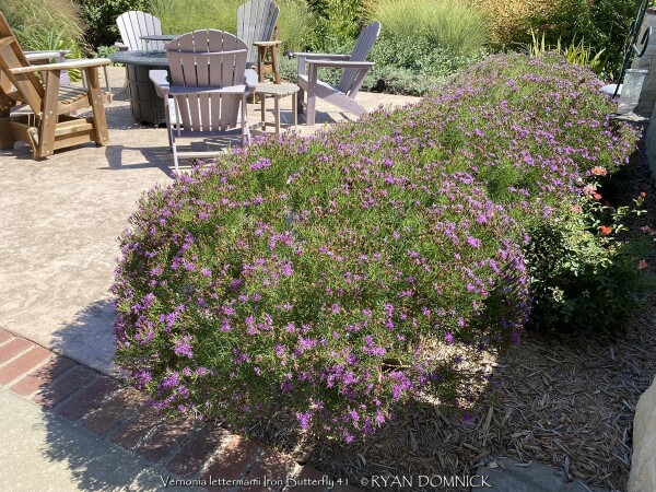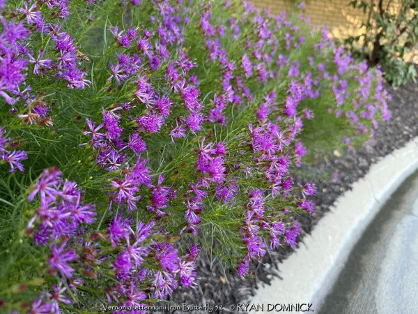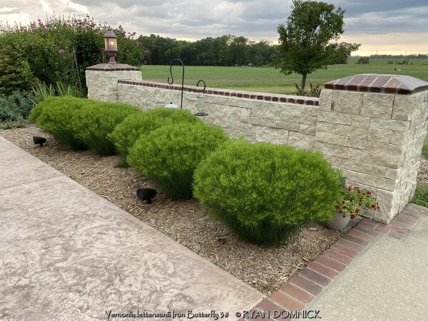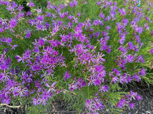 Narrow-leaf Ironweed (Vernonia lettermannii) is a relatively new plant to horticulture; originally discovered in Arkansas along gravel stream beds in the wild. The Iron Butterfly cultivar (Vernonia lettermannii 'Iron Butterfly') is a dwarf compact cultivar introduced by Dr. Allan Armitage at the University of Georgia. This is a true four-seasons perennial that belongs in almost every perennial garden. In the spring, narrow dark green foliage resembling Amsonia hubrichtii creates a compact shrub-like appearance. The growth is so dense that no weeds have a chance of invading a mature stand of plants. By mid to late summer, gorgeous deep purple fine-textured flowers cover the plant for 4-6 weeks. Butterflies, bees, and other pollinators flock to the occasion. Following the bloom, the flower stocks are sturdy and hold up very well for fall and winter interest. The flowers themselves produce mostly non-viable seed and cling to the plant creating a silvery shine whenever sunlight hits it. This can be very useful and dried flower arrangements as well as winter interest gardens. At some point in the winter, all top growth will need to be cut back as this is the only maintenance required. Despite being native to gravel and sand bars along rivers, Iron butterfly Vernonia surprisingly can handle very dry clay, gravelly, or sandy soils along with short periods of flooding. Permanently wet soil is not favored but it can handle the upper portions of a rain garden. Iron butterfly has only one pest problem and that is rabbits! If rabbits are an issue, just put a bowl-shaped chicken wire cage around the plants for the first year. By year #2, the rapidly growing foliage will outgrow any detrimental rabbit browsing. This is definitely one of the most adapted landscape plants in Kansas zone 6a with no problems with heat or cold, dry or wet! It's hard to imagine a perennial garden without this plant!