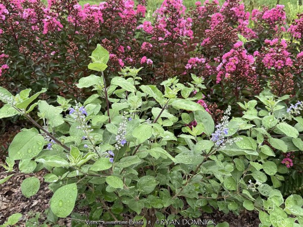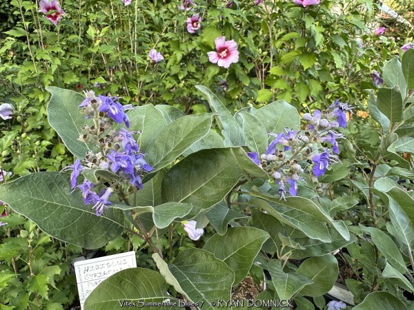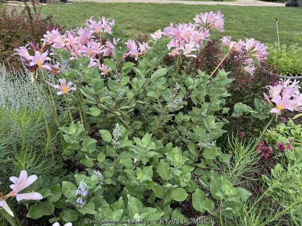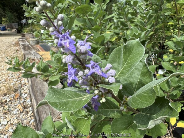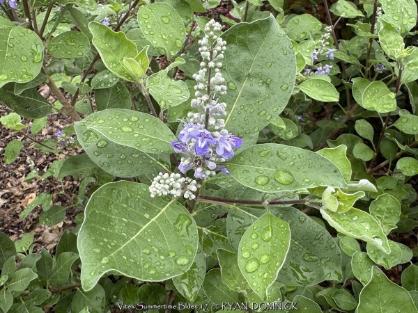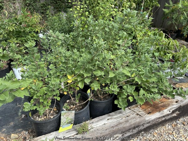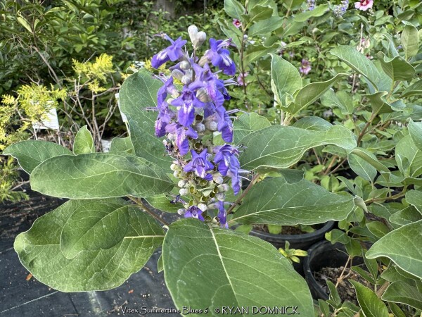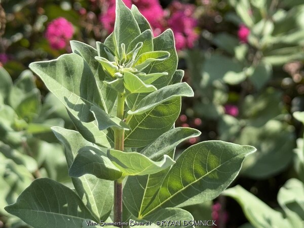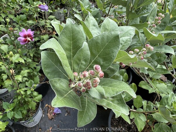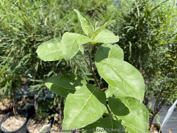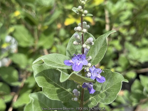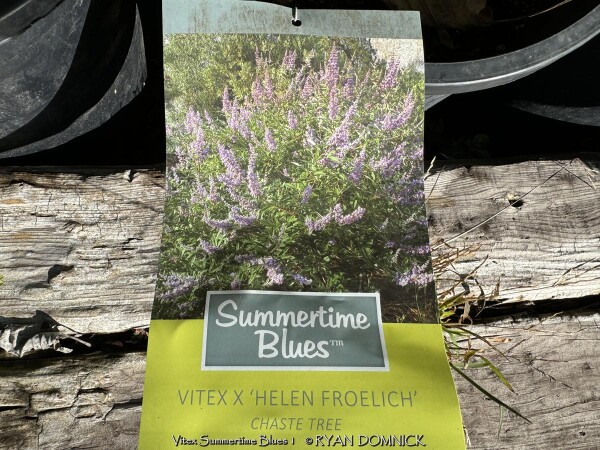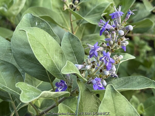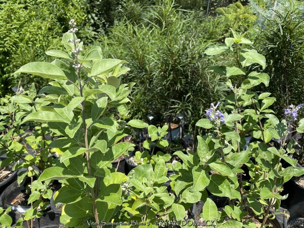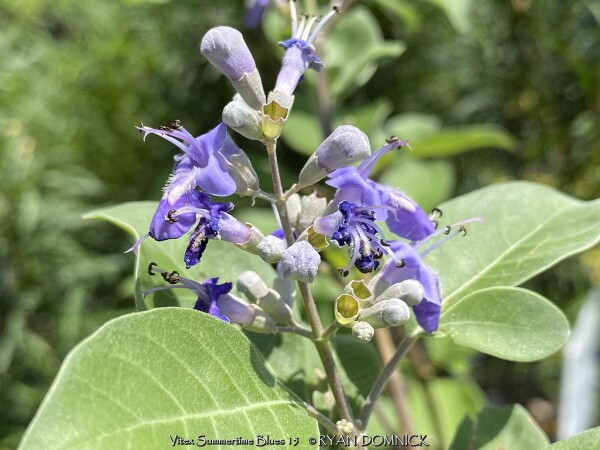 Description from plant breeder, Plant Nouveau: "This new hybrid vitex breaks all of the rules! Selected from a batch of vitex crosses made by former V.P. of Horticulture, Kris Jarantoski of the Chicago Botanic Garden, Summertime Blues has a rounded habit with exceptionally large individual flowers held on black stems. Just imagine a vitex with improved hardiness, that flowers most of the summer and can be used as a shrub…and you have Summertime Blues! Undisputedly an improved selection, Summertime Blues offers multi-season interest for gardens from California to Chicago and even in the deep south. Extreme drought tolerance, a more manageable size, and sterile flowers make the perfect combination for this work horse, easy-to-care-for shrub. Note: This plant has produced no viable seed for the past 15 years and therefore should not have the invasive tendencies of Vitex rotundifolia, which is one of its parents." Vitex agnus castus x rotundifolia ‘Helen Froehlich’ PP31660, Summertime Blues™ is quite a mouthful to say but well worth it in the landscape. We are testing the claims that it may be winter hardy as a shrub with less die back in our Lawrence, KS zone 6a display garden. This is the first year of texting...2024! We will keep you posted.