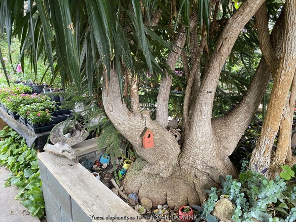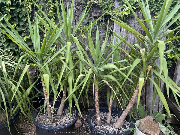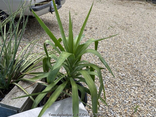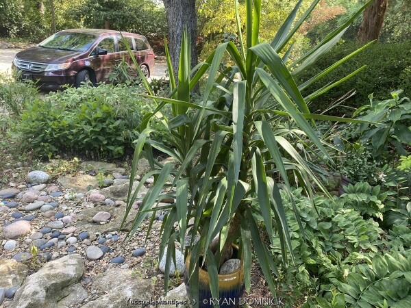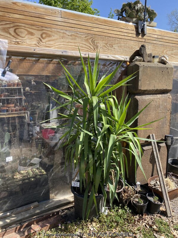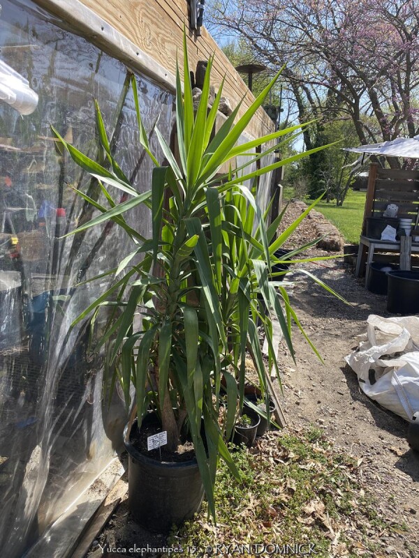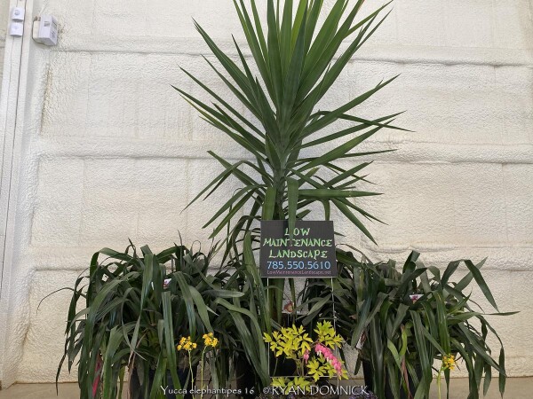 Green sword-like leaves from this yucca (Yucca elephantipes) make an excellent architectural statement. This yucca is native to Mexico and Guatamala but used as a patio plant in Kansas. Place in full sun to part sun with optional extra watering including that which comes from rainfall. Repotting may or may not be needed depending on how large you want the plant to grow; plants can continue to grow taller and tolerate extremely root-bound pots but may need wind bracing. Potted plants are hardy to at least 25 degrees F for a short time if kept dry so you are ok if you miss the first light frost. Do not allow the pot with rootball to freeze solid though. Move into a cold garage, basement, or bright window over the winter with occasional watering. As a winter house plant, it will look presentable all winter long with just a few waterings. Luckily monocarpic flowering will never occur in a potted yucca so you don't have to worry about death after flowering. Potted plants are very low maintenance needing only old leaves trimmed once per year.