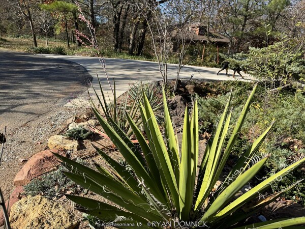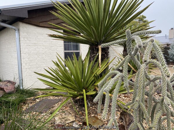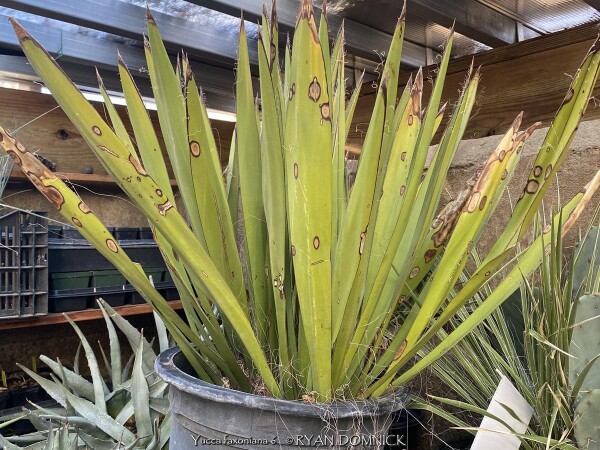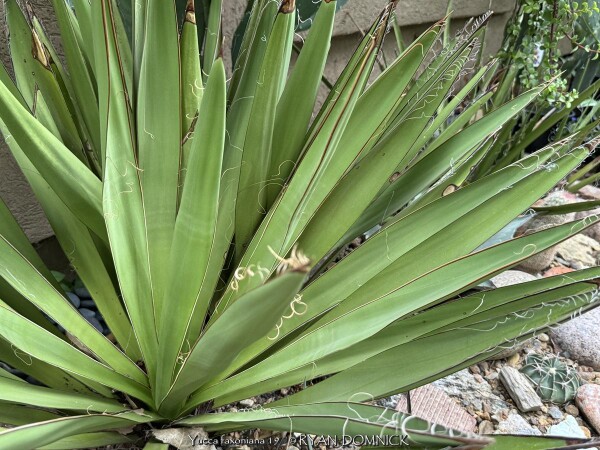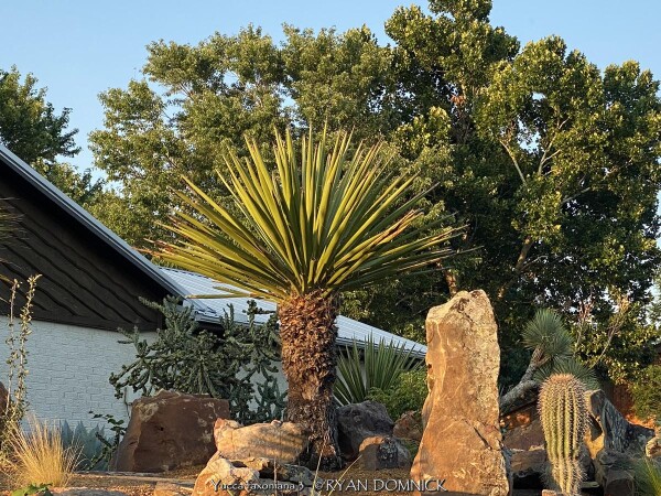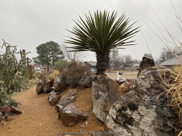 Bright green sword-like leaves from this yucca (Yucca faxoniana) make an excellent architectural statement. Used as a patio plant in Kansas, place in full sun with no extra watering except from rainfall. Repotting may or may not be needed depending on how large you want the plant to grow. Potted plants are hardy to at least 10 degrees F if kept dry so you can wait awhile to move these in for the winter. Then move into a cold garage, basement, or bright window over the winter with NO watering. Many yuccas, including this one, may also be grown from rhizomes, stem cuttings, or by digging offsets from the side of established plants. Having desert heritage, it resents poor drainage and winter moisture. To counteract that in Kansas, plant in full sun on berm with poor sandy or rocky soil with no irrigation. ADDITIONAL INFORMATION ABOUT CREVICE GARDENING: In nature, some of the most interesting xeric plants grow in tough places such as inhospitable rock outcroppings with almost no soil. We can recreate that specific and exclusive growing environment with a crevice garden. Crevice gardening allows you to grow cold-hardy cacti and succulents that are normally cold hardy to our climate (Lawrence, KS zone 6a) but not normally tolerant of excessive moisture (40"/year), especially in the winter. This technique provides optimal xeriscape growing conditions by limiting the amount of soil and water around the roots and reducing the potential of root rot. Start with a raised mound of fast draining soil mix consisting mostly of decomposed granite, coarse sand, gravel, and a small amount of organic matter. Incorporate vertical rock formations such as flagstone into a raised landscape bed creating narrow 1-2" wide crevices filled with the soil mix. This helps quickly channel rain and snow melt water down more deeply into the soil encouraging deeper root growth while keeping the soil dry around the base of the plant. It is important that the entire mound is well above grade level to avoid drainage problems; crevice gardens typically range from 12"-36" tall. After installing the plants, mulch with a thin layer of pea-gravel or decomposed granite. In our Lawrence Kansas zone 6a winters with occasional polar vortexes or arctic blasts, this technique works well in any hot microclimate such as a south facing side of a berm or under a south or west facing roof overhand of a house or building. Kansas Plant Farm LLC built a trial crevice garden in 2022 and we have now had enough time to evaluate the plants after a true winter cold spell. During the arctic blast of January 2024, low nighttime temperatures got down to -11 degrees F (Jan 10th,2024). The longevity of this cold blast was also impressive: 4 days on a row with single digit highs including 1 day with a daytime negative high(-2F), 4 nights of lows in negatives (-8For lower), and 48 straight hours of 0 degrees F and mostly lower. A light snow cover helped insulate the ground but wind blew off most powdery snow on the foliage exposing the top parts of the plants to some extreme temperatures with surprisingly little damage. In our crevice trial gardens in Lawrence, KS (zone 6a), this variety survived a harsh winter so far. Hardiness also confirmed at Denver Botanical Gardens (zone 5b) with several tree-like specimens in protected microclimates near concrete walls.